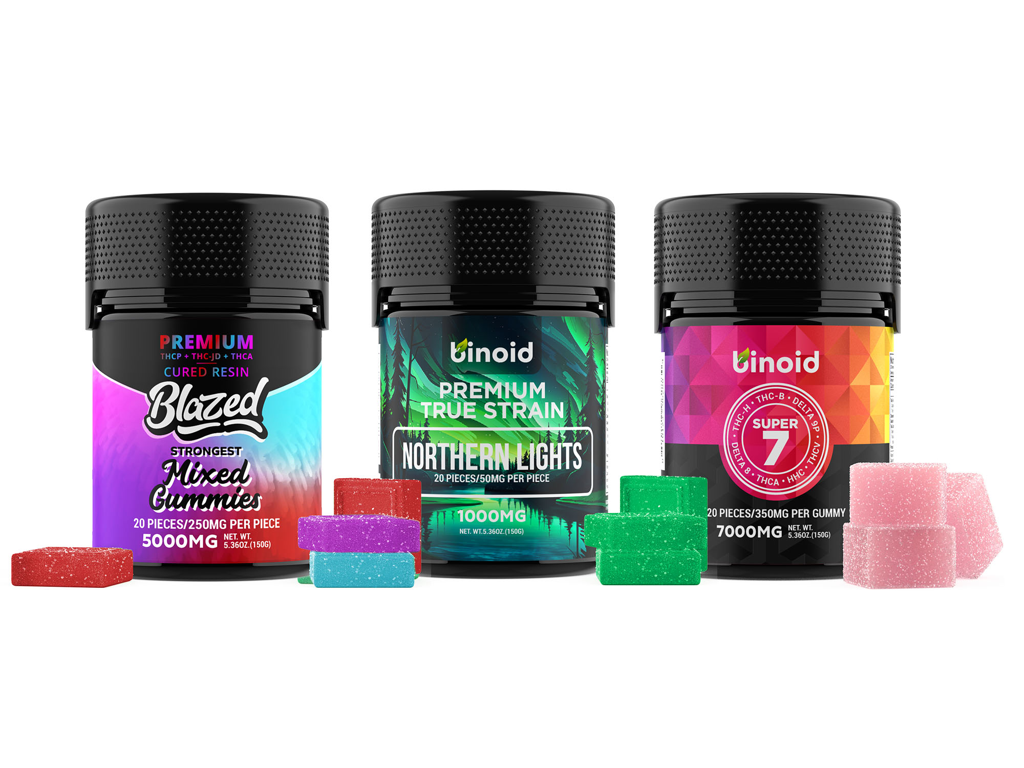 - 3 Pack: 1 Mixed Blazed 5000mg Gummies, 1 Northern Lights, 1 Super 7
